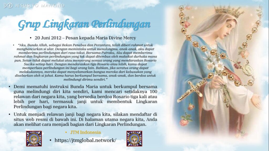 Sesuai instruksi Bunda Kita di atas, kami hendak mengumpulkan setidaknya 100 sukarelawan yang mau membuat janji pribadi, guna mendaraskan tiga Rosario atau lebih per hari dengan intensi “Untuk Membentuk Lingkaran Perlindungan bagi Indonesia.“