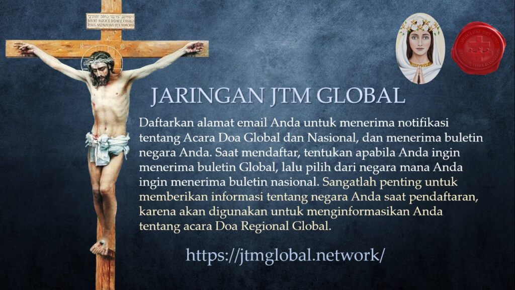 Anda disarankan untuk mendaftar di Jaringan JTM Global untuk menerima informasi tentang acara-acara JTM Global (acara doa dan seminar), serta membaca Pesan-pesan Kitab Kebenaran dan Doa-doa Perjuangan.