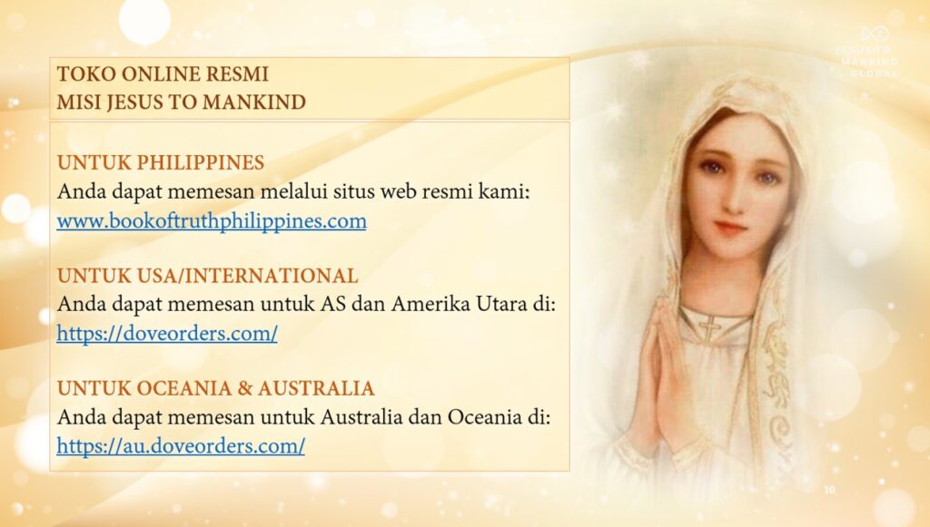 Anda disarankan untuk membeli buku-buku dan sakramentali terkait Misi Jesus to Mankind hanya di situs web resmi Misi. Ini akan melindungi Anda dari barang-barang tiruan dan sakramentali palsu yang tidak memiliki berkat dan perlindungan yang dianugerahkan oleh Surga.