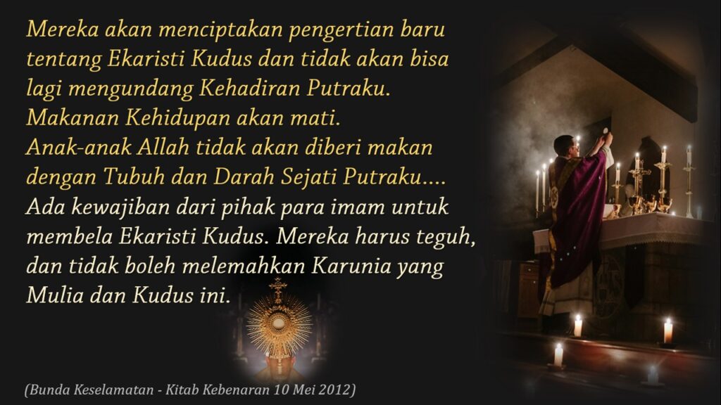 Mereka akan menciptakan pengertian baru tentang Ekaristi Kudus dan tidak akan bisa lagi mengundang Kehadiran Putraku. Makanan Kehidupan akan mati. Anak-anak Allah tidak akan diberi makan dengan Tubuh dan Darah Sejati Putraku.