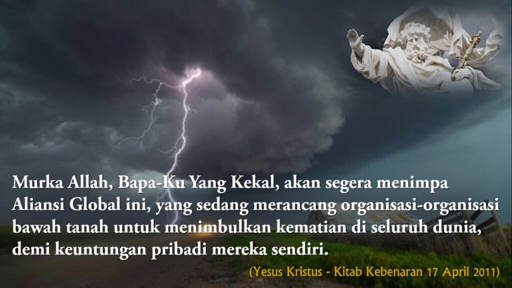 Putri-Ku yang terkasih, dengan penuh kesedihan Aku harus menyampaikan kepadamu bahwa bencana-bencana ekologis yang akan datang akan mengakibatkan banyaknya korban jiwa di Asia, Eropa, Rusia dan Amerika Serikat. Murka Allah, Bapa-Ku Yang Kekal, akan segera menimpa Aliansi Global ini, yang sedang merancang organisasi-organisasi bawah tanah untuk menimbulkan kematian di seluruh dunia, demi keuntungan pribadi mereka sendiri. Mereka bertanggung jawab atas penciptaan ladang-ladang kekayaan dan berbagai teknologi baru, yang dapat membuatmu terpesona seandainya tujuan mereka tidak begitu jahat. Orang-orang ini, dari setiap negara maju di dunia, adalah orang-orang kaya, berkuasa, berbakat, dan mengendalikan bank-bank, militer, organisasi kemanusiaan dunia, kepolisian, pemerintahan, pasokan energi, dan media. Tak seorang pun dari kamu yang bisa lolos dari cengkeraman mereka kecuali Aku memberitahu caranya.
