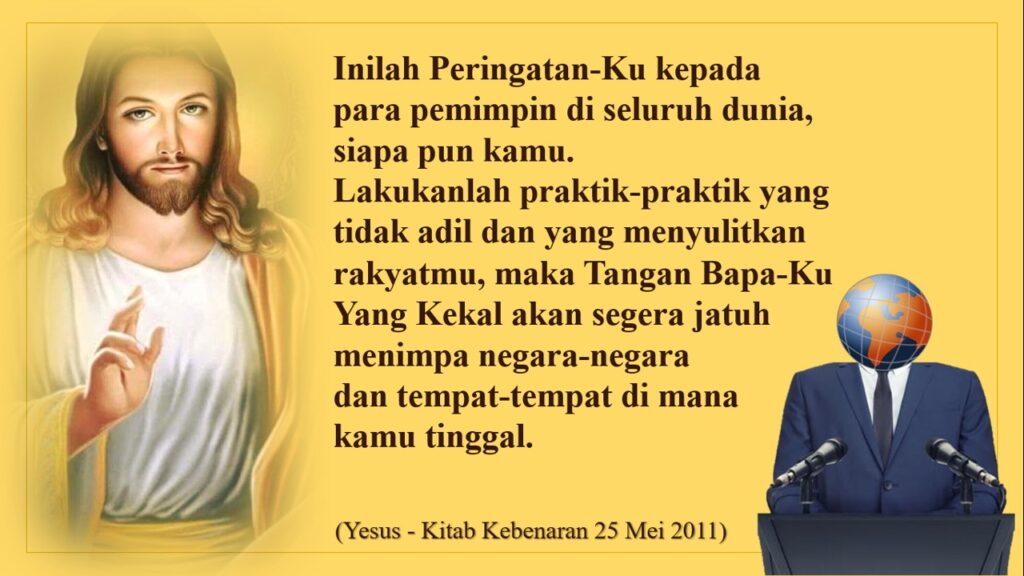 Inilah Peringatan-Ku kepada para pemimpin di seluruh dunia, siapa pun kamu. Lakukanlah praktik-praktik yang tidak adil dan yang menyulitkan rakyatmu, maka Tangan Bapa-Ku Yang Kekal akan segera jatuh menimpa negara-negara dan tempat-tempat di mana kamu tinggal. Bapa-Ku tidak akan lagi menolerir perbuatan-perbuatan dosamu. Cobalah untuk bersembunyi, tetapi itu akan sia-sia. Senjata-senjata pemusnahmu akan dihancurkan. Perlakuanmu terhadap sesama warga negara akan menciptakan situasi, di mana suka atau tidak suka, kamu harus bertanggung jawab kepada Allah Bapa Yang Kekal. Tanggung jawab moralmu harus dipatuhi, karena pada akhirnya kamu akan dihakimi berdasarkan perbuatanmu.